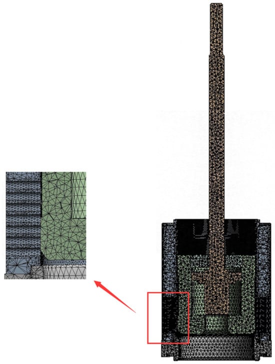 Taking the meshing of a 10% opening valve core assembly as an example, the fluid domain meshing method and mesh data are consistent with those used in flow field simulation analysis. The valve core assembly is meshed using adaptive meshing and local mesh control techniques. The mesh is primarily tetrahedral, and the sleeve drainage holes are meshed with surface mesh refinement. To improve the accuracy of the calculation results, the mesh independence of the molten salt regulating valve core assembly was verified, as shown in Table 5. As the number of mesh elements increases, the maximum stress value increases accordingly. When the number of mesh elements increases from 204,963 to 335,614, the maximum stress value increases from 171.65 MPa to 190.25 MPa, a 9.78% increase. When the number of mesh elements increases from 335,614 to 471,624, the maximum stress value increases from 190.25 MPa to 203.63 MPa, a 6.56% increase. When the number of mesh elements increases from 471,624 to 567,251, the maximum stress value increases from 203.63 MPa to 204.56 MPa, a 0.46% increase. When the number of mesh elements increases from 567,251 to 601,256, the maximum stress value increases from 204.56 MPa to 204.89 MPa, a 0.16% increase. Taking into account both the calculation accuracy and the calculation cost, a smaller number of cells with a maximum stress value difference of no more than 1% was selected for numerical simulation [20]. The number of grid cells was finally determined to be 471,624 and the number of grid nodes was 798,163 as the grid model of the regulating valve core assembly, as shown in Figure 16.