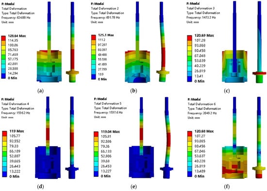 The vibration characteristics of the system can be determined by modal analysis. The linear combination of each order natural vibration mode is used to represent the vibration mode of the structure. However, the vibration characteristics of the system are usually determined by the low-order natural frequencies, and the external excitation is mostly low-frequency excitation. Therefore, when performing modal analysis, only focusing on low-order frequencies can meet actual engineering needs [24]. Based on this, taking 10% opening as an example, the first six modes and vibration mode characteristics of the valve core component are selected for analysis. The specific results are shown in Figure 17.
