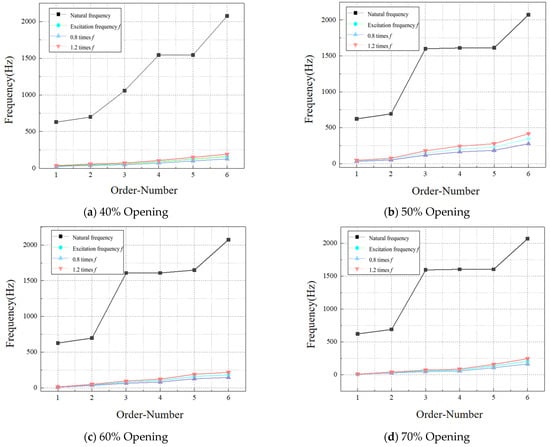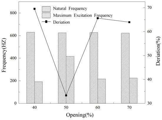 The range of 0.8 to 1.2 times the excitation frequency of the pressure pulsation of the molten salt regulating valve is called the resonance zone [25]. When the natural frequency of the valve core assembly is within the resonance zone, flow-induced resonance will occur, and in severe cases, the valve core assembly will break. According to the pressure pulsation frequency domain distribution diagram at different openings obtained by calculating the transient flow field of the regulating valve, it can be seen that with the increase in the opening, the pressure pulsation fluctuation gradually increases and the excitation frequency of the peak point gradually approaches the natural frequency. Therefore, based on the transient calculation results and modal calculation results of the flow field at 40%, 50%, 60%, and 70% openings of the regulating valve, the flow-induced resonance analysis of the valve core motion assembly of the molten salt regulating valve is carried out by extracting the frequency of the peak point of the frequency domain spectrum. By comparing and analyzing the main frequency of the fluid excitation and the modal frequency, it is determined whether the valve core assembly will have flow-induced resonance, as shown in Figure 18. In order to further study the flow-induced resonance of the molten salt regulating valve, by drawing a comparison diagram of the natural frequency and the maximum frequency of the flow-induced resonance, the numerical difference of the frequency distribution of the valve core assembly under typical working conditions is deeply analyzed, as shown in Figure 19.