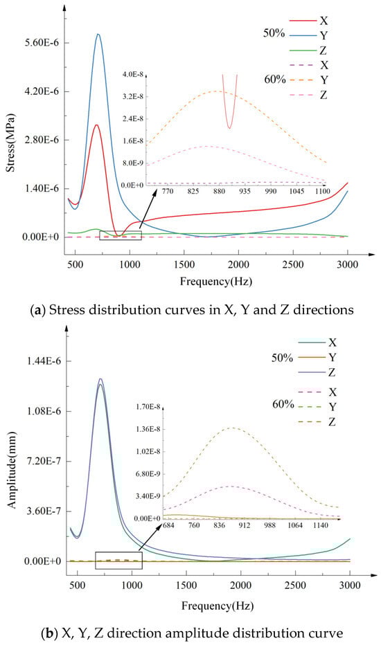 Based on the harmonic response analysis results, stress and amplitude distribution curves in three directions at two openings were plotted, as shown in Figure 21. Figure 21a shows that the Y-direction vibration stress of the valve core assembly reaches its maximum at both 50% and 60% openings, with values of 8.86 × 10−6 MPa and 3.26 × 10−8 MPa, respectively. The stress fluctuation at 50% opening is significantly higher than at 60% opening. Figure 21b shows that the Z-direction amplitude is maximum at 50% opening, with a value of 1.32 × 10−6 mm, while the Y-direction amplitude is maximum at 60% opening, with a value of 1.33 × 10−8 mm. The most dramatic amplitude fluctuation occurs at 50% opening. In summary, when the molten salt regulating valve is at 50% opening, the damage to the valve core assembly caused by the drastic change in amplitude is more prominent. In practical applications, long-term continuous operation of the molten salt regulating valve at this opening should be avoided as much as possible to reduce vibration damage. At the same time, the selection of the valve core assembly material can be optimized based on the stress characteristics under this working condition, thereby achieving a limited extension of the valve core assembly’s service life.