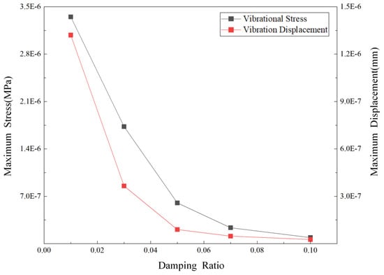 Figure 22 shows that the maximum stress and maximum displacement of the control valve core assembly decrease with increasing damping ratio. When the damping ratio increases from 0.01 to 0.03, the maximum vibration stress and maximum displacement of the valve core assembly decrease by 48.36% and 72.50%, respectively. When the damping ratio increases from 0.03 to 0.05, the maximum vibration stress and maximum displacement of the valve core assembly decrease by 65.14% and 75.45%, respectively. When the damping ratio increases from 0.05 to 0.07, the maximum vibration stress and maximum displacement of the valve core assembly decrease by 60.86% and 46.65%, respectively. When the damping ratio increases from 0.07 to 0.10, the maximum vibration stress and maximum displacement of the valve core assembly decrease by 61.74% and 44.56%, respectively. In summary, as the damping ratio gradually increases, the maximum vibration stress of the valve core assembly maintains a significant downward trend, while the decline in the maximum vibration displacement gradually decreases, that is, the decline is more significant in the early stage and slows down in the later stage. In summary, this study can provide a basis for the material selection, parameter design, and structural optimization of the spring of the spool assembly of the molten salt regulating valve by quantifying the relationship between the damping ratio and the vibration characteristics. It can not only control the vibration stress and displacement of the valve core by regulating the spring damping characteristics and reduce problems such as valve core fatigue damage caused by vibration but also avoid the cost increase and dynamic response performance degradation caused by blindly selecting high-damping springs and ultimately achieve a safe and stable operation and economic balance of the molten salt regulating valve in the pipeline.