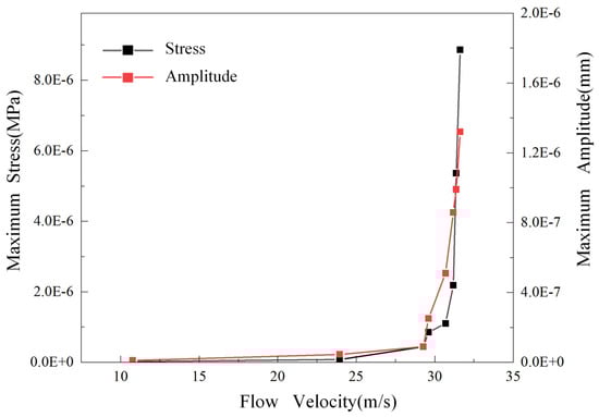 Based on the flow field analysis results, the pressure pulsation vibration characteristics at different average flow rates were numerically simulated and calculated, and the stress and amplitude of the valve core component at different average flow rates were obtained, as shown in Figure 23.