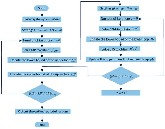 | 1: Parallelizable Computation Outer -Loop C&CG: Set the lower bound , the upper bound , the number of iterations , the convergence threshold , the seasonal scenario probability , the typical day scenario probability , the power purchase and sale price , and the wind-solar and electric-heat load . 2: repeat 3: Substitute into MP, optimize to get () and the objective function value , and update . 4: Parallelizable Computation Inner -Loop C&CG: Set the lower bound , the upper bound , the number of iterations , and the convergence threshold . 5: repeat 6: 7: repeat 8: Substitute () into SPM, optimize to get and the objective function value , and update . 9: Substitute into SPS, optimize to get and the objective function value , and update . 10: . 11: until , and return as to MP. 12: until 13: Substitute into , optimize to get and the objective function value , and return as to MP. 14: Substitute into , optimize to get and the objective function value , and return as to MP. 15: Update . 16: . 17: unti , and output the optimization result. |