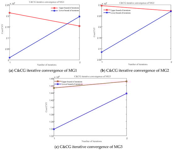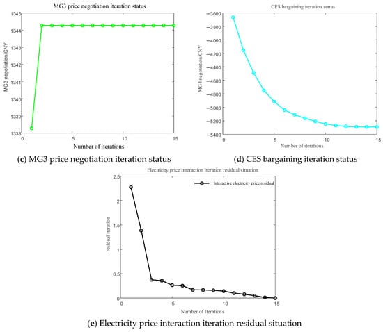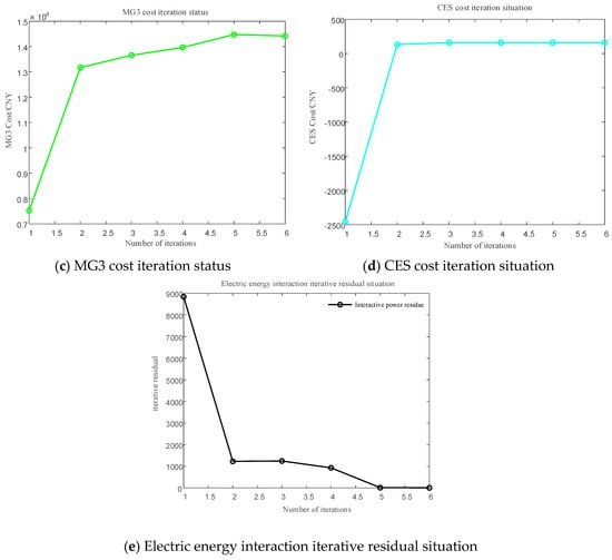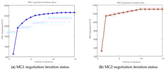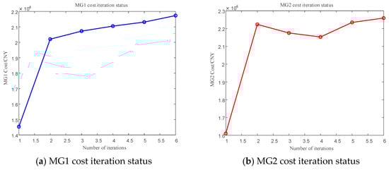 - Set the maximum iteration count , convergence precision ζ = 0.1, penalty factor γ = 10, initial iteration count k = 1, and initial inter-MG trading price .