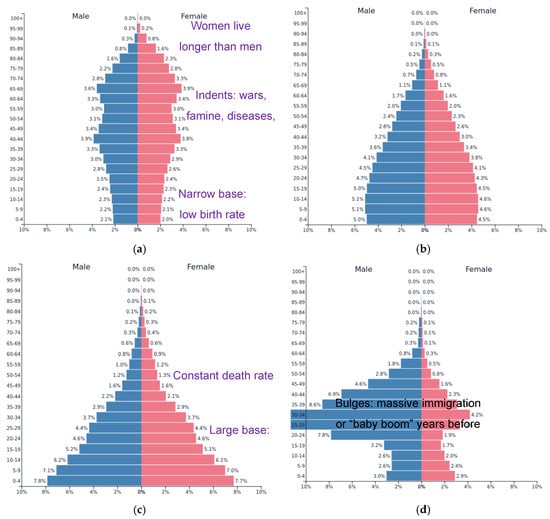 The Qatar situation in Figure 6d is reported only to show how the effects of immigration may distort the shape of a PP. In this case, the age distribution of the small autochthonous population (about 2 million inhabitants) shows a sizeable influx of immigrant workers from India, Egypt, Bangladesh, and the Philippines, mostly males aged 20 to 40.