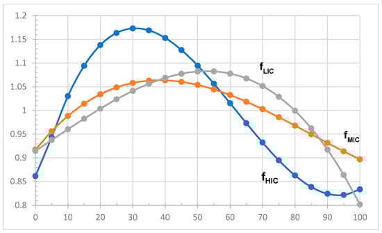 - Lower- and Medium-Income Countries (LMIC): Estiri’s [] data were heuristically modified as to the skewness among the age groups. In other words, the fj for LIC and MIC are smaller in the productive- and higher in the retirement age groups than for their HIC counterparts, to reflect the qualitatively known consumption patterns in those types of society.