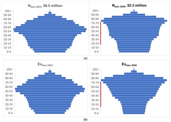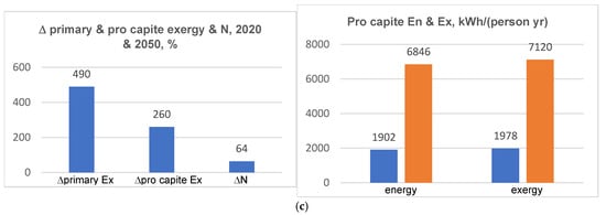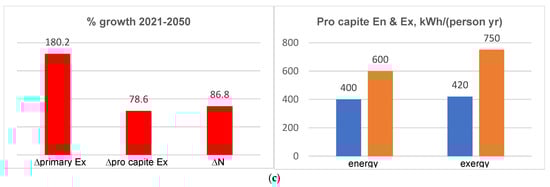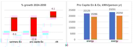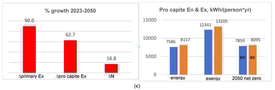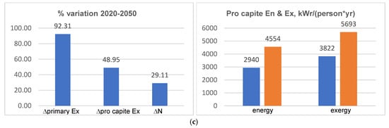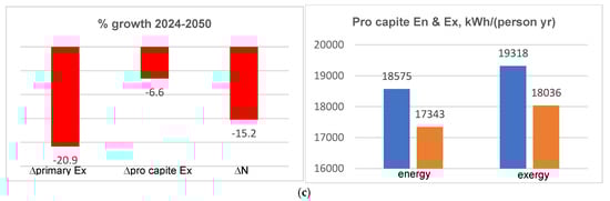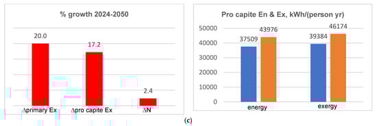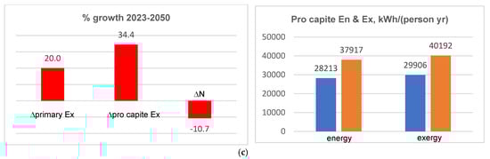 Between 2023 and 2050, the Italian population will decrease by 10.7% and age, but the PP will remain of the HIC type (Figure 8). The primary exergy consumption will shift towards higher age cohorts (from 50–65 to 70–80) that are not in the “productive age range”. Primary energy use will increase by 20% and pro capite primary exergy by 34.4%.