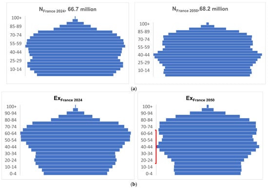 (a) Population pyramids for France 2024 and 2050, (b) exergy allocation by age cohorts, France 2024 and 2050, (curly brackets indicate the legal working age), (c) energy, exergy, and population statistics for France 2024 and 2050. Blue: 2024; Orange: 2050.