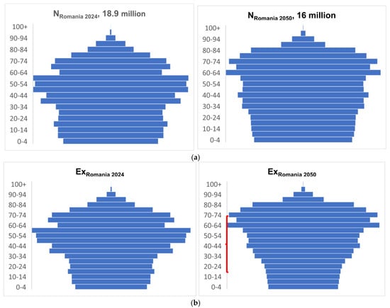 PP and exergy/age profile, Romania 2024 and 2050. Data from [,].