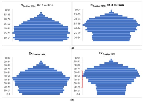 (a) Population pyramids for Turkiye 2024 and 2050, (b) exergy allocation by age cohorts, Turkiye 2024 and 2050, (curly brackets indicate the legal working age), (c) energy, exergy, and population statistics for Turkiye 2024 and 2050. Blue: 2023; Orange: 2050.