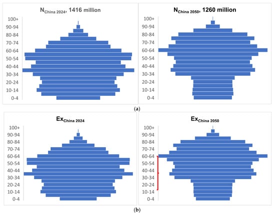 PP and exergy/age profile, China 2024 and 2050. Data from [,,].