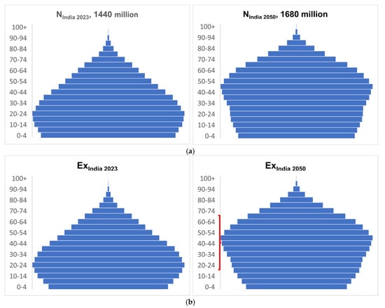 PP and exergy/age profile, India 2023 and 2050. Data from [,,,].