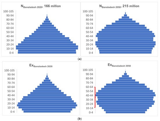 PP and Exergy/age profile, Bangladesh 2020 and 2050. Data from [,].