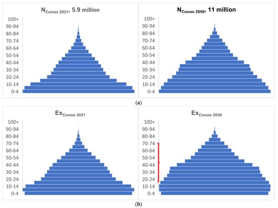 PP and exergy/age profile, Congo 2021 and 2050. Data from [,,].