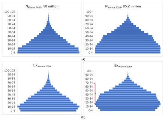 PP and exergy/age profile, Kenya 2020 and 2050. Data from [,,].