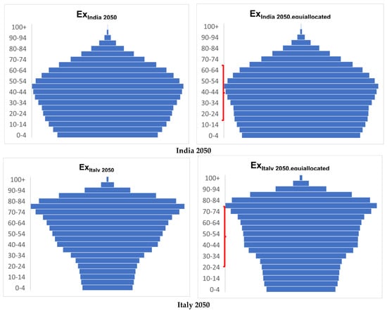 To gain some insight about the influence of the exergy-age allocating factor fj, a comparison was made between the exergy-age pyramids of Italy (HIC) and India (MIC) calculated using the values of Figure 7 and equiallocated, i.e., as if each age cohort were to use the same portion of the primary exergy input. The results are shown in Figure 17 and demonstrate that the fj factors have indeed a major influence on the allocation to the junior age groups. This calls for additional research on the exergy-age consumption patterns. Anyhow, in a methodological study like the one presented here, it is essential to describe and discuss the procedure. As further data become available, the results (and the analysis) can be updated.