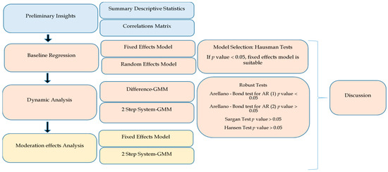 The methodological procedure of FE, RE, and GMM estimations is summarized in Figure 1. This multi-step framework ensures robustness by comparing static and dynamic estimators, addressing potential biases, and validating the reliability of the results through diagnostic tests.