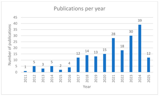 The early phase (2011 to 2016) recorded minimal research, ranging between one to five publications per year (Figure 1). Smart charging for electric mobility was a new concept during this stage. A noticeable growth was recorded in 2017, with 12 publications. Between 2017 and 2020, moderate growth between 12 and 15 publications was recorded yearly. This could be attributed to growing policy support from most governments, laying the groundwork for smart charging. Substantial growth was recorded in 2021, with 28 publications and a high of 39 publications in 2024. The significant growth can be attributed to an increase in smart charging resulting from technological innovations, policy, and charging infrastructure developments. The noticeable decline to 12 publications in 2025 (Figure 1) is likely due to the incomplete indexing of publications for the current year.