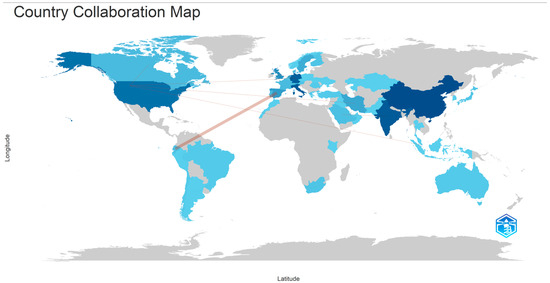 The country collaboration map visually depicts the intensity (colours) and direction (lines) of collaboration amongst countries in a field [25]. The country collaboration map shows that strong collaborations (thicker lines) exist between Spain and Ecuador (Figure 2). The collaboration primarily focuses on user-responsive EV charging optimisation models that heavily rely on aggregators and are tested using simulated urban distribution networks. The USA collaborates with Canada, Iran, and Singapore. For instance, collaborations between the USA and Singapore primarily focus on electrifying on-demand vehicle fleets (i.e., ride-hailing) and the infrastructure, policy, and data integration required to facilitate this transition. The highest research output on the topic emanates from China, India, Germany, and the USA (dark blue colour). In contrast, the emerging/least research output (light blue colour) emanates from countries like South Africa, Kenya, Argentina, Brazil, Saudi Arabia, Indonesia, and Australia (Figure 2). For instance, research in South Africa primarily focuses on how smart charging strategies can mitigate the strain on power grids to make large-scale EV adoption more feasible and sustainable.