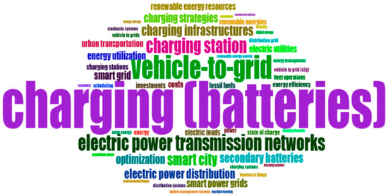 A word cloud, which visually represents keywords in a text using different colours based on their frequency, was used to show the commonly used keywords and their relationships on the topic. Charging (batteries) is the most prominent keyword, located at the center of the word cloud (Figure 3). This implies that charging (batteries) is a key enabler of smart charging for electric mobility in urban areas. In the word cloud, charging (batteries) is surrounded by other large keywords like smart-grid, vehicle-to-grid, and electric power transmission networks. This indicates that battery charging is becoming a key component of modern grid networks that support smart charging in urban areas. Charging station, charging infrastructures, and charging strategies are placed on top of each other next to vehicle-to-grid in the word cloud. This indicates the logistical and deployment challenges. Keywords like internet of things, machine learning, learning systems, smart grid, energy storage, energy efficiency, and renewable energy resources are located at the edges of the word cloud. This suggests emerging technological innovations and renewable energy efforts in smart charging for electric mobility in urban areas. Keywords like social acceptance, regulations, and policy frameworks are not represented in the word cloud (Figure 3).