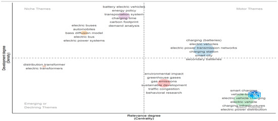 The motor theme (quadrant one) comprises keywords such as charging (batteries), charging station, electric power transmission networks, smart city, and secondary batteries (Figure 4). This represents technological and infrastructural systems that form the foundation (i.e., backbone) of smart charging for electric mobility in urban areas. They represent well-established areas that require supportive regulatory frameworks for large-scale deployment of smart charging in urban areas. The basic themes (quadrant two) relate to grid integration and sustainability concerns. The theme on grid integration includes keywords like smart charging, vehicle-to-grid, and electric power distribution, while the theme on sustainability concerns comprises keywords such as environmental impact, greenhouse gases, gas emissions, sustainable development, and traffic congestion. Since the themes are relevant but underexplored, there is a need for in-depth research to fully exploit the potential of smart charging for electric mobility in urban areas. The niche theme (quadrant four) relates to keywords such as electric buses, energy policy, transportation system, charging time, and demand analysis. To maximise the impact of smart charging for electric mobility in urban areas, deeper insight into energy policies and demand analysis is necessary, guiding policymakers and researchers toward future priorities. The emerging or declining themes (quadrant three) include keywords like distribution transformer and electric transformer (Figure 4). They represent peripheral areas that may warrant monitoring or deprioritising of research efforts.