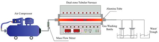 A fixed-bed combustion system was employed for the experiment involving kaolin blending to retain sodium, as shown in Figure 1. The system consists of an air supply unit, a heating unit, and a gas-washing unit. The air supply unit is composed of an air compressor and a mass flow meter. The heating unit utilizes a TL1500-1500 dual-zone tubular furnace. The gas-washing unit employs dilute nitric acid and low-concentration sodium hydroxide solutions to absorb the flue gas generated during the reaction.