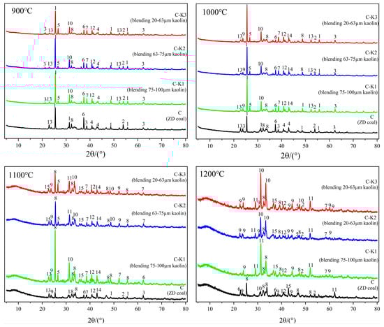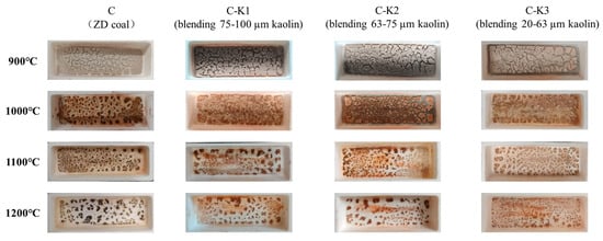 Figure 2 illustrates the macroscopic morphology of coal ash under different reaction conditions. At 900 °C, the coal ash appears predominantly grayish white, with the surface exhibiting a distinctly loose texture. When the temperature exceeds 1000 °C, the coal ash without kaolin addition turns reddish brown. Although the ash samples remain relatively loose, noticeable agglomeration is observed. Although the blended samples with added kaolin also showed signs of agglomeration, the extent of molten agglomeration decreased significantly with decreasing kaolin particle size, and the overall ash yield was also noticeably reduced.