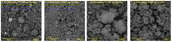 At 1100 °C, the morphology of the coal ash undergoes significant changes. For ash blended with 75–100 µm kaolin, the surface displays large particles exceeding 80 µm in diameter. Additionally, adhesion is observed both among small particles and between small and large particles, which may be attributed to sintering phenomena occurring at elevated temperatures. In contrast, for ash blended with 20–63 µm kaolin, no obvious large particles are observed on the surface; however, the adhesion between particles is more pronounced, suggesting that the smaller particles undergo fusion, resulting in more extensive bonding [29].