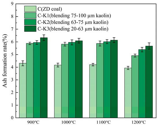 Figure 4 presents the ash formation rate for kaolin blending with varying particle sizes. It can be seen that at the same combustion temperature, the ash formation rate is negatively correlated with the particle size of the added kaolin, indicating that a decrease in particle size leads to an increase in the ash formation rate. This may be attributed to the fact that kaolin with smaller particle sizes has a larger specific surface area, which offers more active adsorption sites, thereby enhancing its ability to adsorb gaseous substances and increasing the ash formation rate.