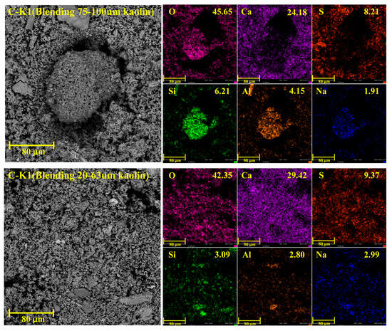 Figure 6 shows the distribution of elements on the surface of coal ash with different particle sizes of kaolin blended at 1000 °C. In the case of blending 75–100 µm kaolin, there are large particles larger than 80 µm, with loose surfaces and numerous small pores. The surface of the large particles is mainly composed of Si and Al, along with some sodium and a small amount of calcium. It is speculated that the main component is a sodium-calcium-containing aluminosilicate. The particles around the large particles are distributed relatively evenly. The main elements are Ca, S, and O. Based on XRD analysis, the main mineral is calcium sulfate. As the particle size of blended kaolin is reduced to 20–63 µm, the particle sizes of the surface particles of the ash sample become uniform. By comparing C-K1 with C-K3, it was found that after adding large-sized kaolin, the surface Na content of the ash sample was lower than that of the small-sized one. The smaller the particle size is, the higher the content of adsorbed alkali metal Na.