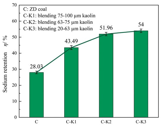 To investigate the sodium capture performance of kaolin with different particle sizes in raw coal at various temperatures, the chemical extraction method was employed to measure the sodium content in coal ash [28]. The capture performance of sodium in coal ash is represented by the sodium retention rate η, and the calculation formula is shown in Equation (1).