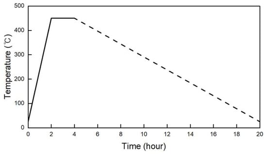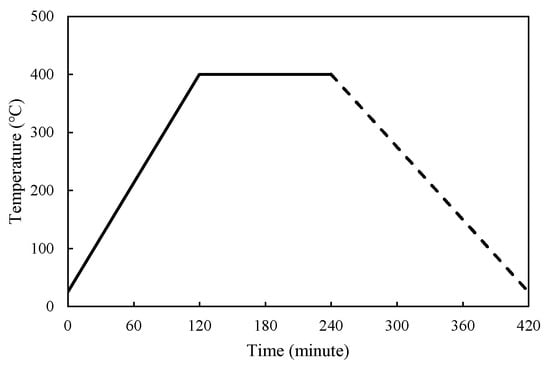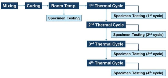 After fabrication, some samples were evaluated at room temperature, whereas other samples were placed into an electric oven for heat exposure. This process included four thermal cycles overall, which were selected to represent the realistic conditions of thermal energy storage (TES) applications. The thermal cycle scenario applied for each thermal cycle in this study consisted of a 2 h heating stage, a 2 h high-temperature holding stage, as shown in solid line in Figure 1 and a subsequent 16 h natural cooling stage, as shown in dashed line in Figure 1. This scenario was designed to represent the actual thermal energy storage systems, in which the durations of charging and discharging processes are generally similar. However, due to the limitations of the electric oven used in the experiment, the cooling rate could not be mechanically controlled. Therefore, after the heating and holding stages, the oven door was slightly opened to allow natural cooling for 16 h to ensure that the samples cooled down gradually without experiencing thermal shock. Figure 1 shows the thermal cycle scenario for the heat exposure process, and the test sequence is shown in Figure 2.