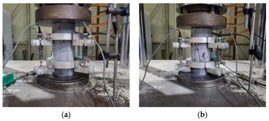 Cylindrical samples with a diameter of 100 mm and a height of 200 mm were prepared for compressive and splitting tensile strength tests. The equipment used for the experiments was a universal testing machine (UTM) with a capacity of 2000 kN, and the tests were conducted under displacement control. The compressive strength tests were conducted at a loading rate of 0.8 mm/min, whereas the splitting tensile strength tests were conducted at a loading rate of 0.3 mm/min. The compressive strength and splitting tensile strength were measured before and after high-temperature exposure. To ensure reliability, three measurements were evaluated, and the average value was used. Figure 3 and Figure 4 show the overall view of the experiment setup and the failure patterns of compressive strength and splitting tensile strength, respectively.