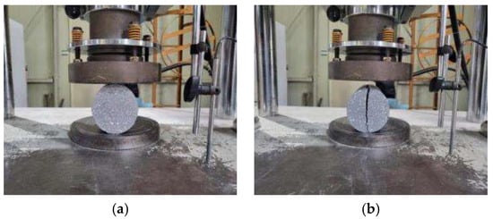Splitting tensile strength test: (a) experimental setup and (b) failure pattern.