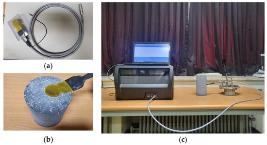 Thermal conductivity and specific heat were measured before and after each thermal cycle with a thermal conductivity measuring device. Techniques for measuring concrete thermal conductivity include ASTM D5334-00 [24], a guarded hot plate (GHP), a heat flow meter, and the transient plane source (TPS) method. The TPS method was applied according to ISO 22007-2 [25] in this study. Measurements were performed by inserting a temperature device between two samples, as shown in Figure 5. A TPS-1500 instrument (Hot Disk Ltd., Gothenburg, Sweden) was used. The center of the cylindrical samples was cut, and then a thermal measurement sensor was inserted between the two cut samples to measure thermal conductivity and specific heat. The thermal measurement sensor consists of a nickel-based double helix, which transmits heating current and detects or controls voltage drops. The thermal conductivity and specific heat of concrete were measured by supplying heat waves with a power of 0.3 W from a heat source, and the measurements were performed three times for each sample to increase the reliability of the experimental results.