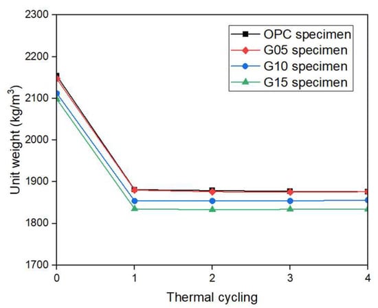 The unit weights for various mixtures before and after four thermal cycle applications are presented in Figure 6. The unit weight of the OPC specimen at room temperature was 2154 kg/m3, whereas the unit weights of the G05, G10, and G15 specimens were 2147, 2112, and 2098 kg/m3, respectively; these were reduced by 0.3%, 2%, and 2.6% with respect to the OPC specimens. After high-temperature exposure (after four cycles), the unit weight of the OPC specimens was 1876 kg/m3, whereas the unit weights of the G05, G10, and G15 specimens were 1876, 1856, and 1834 kg/m3, respectively; these results indicated a decrease in unit weight with increasing graphite content. The unit weight of the concrete specimens decreased under both room temperature conditions and high-temperature exposure as the graphite content rate increased; these results were attributed to the lower density of graphite than of OPC. In addition, the flake morphology of graphite weakens the matrix of the mixture. Graphite is hydrophobic; thus, it does not readily interact with water in cement paste [26]. As a result, the addition of graphite creates more voids in the matrix, increasing porosity and decreasing the unit weight.