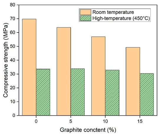 The results from the compressive strength test before and after exposure to high temperatures are shown in Figure 7. At room temperature, the compressive strength of the OPC series specimen was 69.8 MPa, whereas the values for the G05, G10, and G15 series specimens were 63.7, 57.0, and 49.3 MPa, respectively. The compressive strengths of the graphite series specimens were 8.8%, 18.4%, and 29.4% lower than those of the OPC specimens. The difference in the compressive strengths between the OPC series and graphite series specimens resulted from the presence or absence of the components of CaO, SiO2, Al2O3, and Fe2O3. These components induced hydration reactions and were present in the OPC, as shown in Table 1. In contrast, these components were not present in the graphite composition. Finally, a remarkable decrease in compressive strength occurred as the graphite content increased.