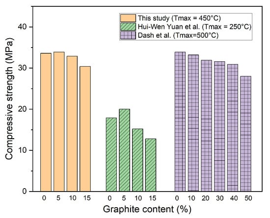 Moreover, after high-temperature exposure, the compressive strengths of the OPC, G05, G10, and G15 specimens decreased by 51.9%, 46.7%, 42.4%, and 38.3%, respectively, compared with the compressive strength at room temperature. Evidently, the decrease in the compressive strength of the graphite-containing specimens was lower than that of the OPC specimen because of the thermal resistance of the graphite under high-temperature conditions. In addition, the high thermal conductivity of graphite enables heat to be dispersed more evenly throughout the sample and thus decreases the thermal stress, which may cause internal cracking in the concrete. The compressive strength results after high-temperature exposure in this study were greater than those reported in previous studies [27] and were similar to the results of another study [28], as shown in Figure 8. In addition, the compressive strength of the concrete with graphite in this study was greater than that of the concrete using high-temperature material in previous studies, as shown in Table 4.