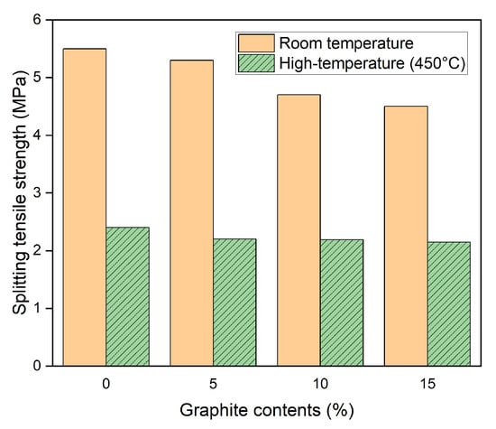The resulting splitting tensile strengths before and after exposure to a high temperature of 450 °C are shown in Figure 9. At room temperature, the splitting tensile strength of the OPC series specimen was 5.5 MPa, whereas the splitting tensile strengths of the G05, G10, and G15 series specimens were 5.3, 4.7, and 4.5 MPa, respectively; these values were 4.6%, 15.2%, and 19.4% lower than that of the OPC specimen. The splitting tensile strength decreased as the graphite incorporation rate increased. The inactive graphite in the mixture hindered the development of hydration products, decreasing the rate of hydration of cement. In addition, when graphite is mixed directly into concrete, the graphite tends to agglomerate, causing defects such as open porosity, which can also negatively affect the mechanical properties.