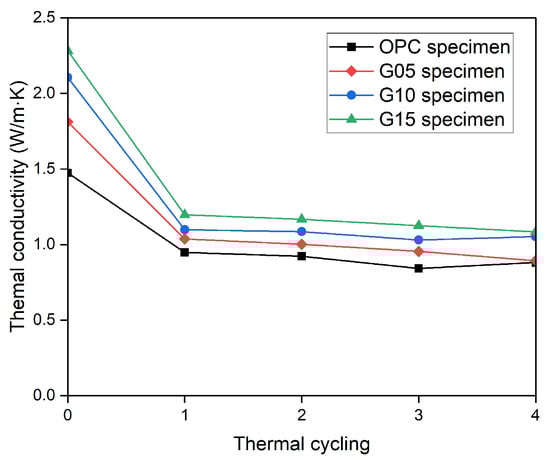 After high-temperature exposure for four thermal cycles, the thermal conductivity of the OPC specimen was 0.88 W/m·K, whereas the thermal conductivities of the G05, G10, and G15 series specimens were 0.86, 1.05, and 1.08 W/m·K, respectively. As the graphite content increased, the thermal conductivity of the concrete remained higher than that of the control samples at room temperature and even after high-temperature exposure. Compared with those at room temperature, the thermal conductivities of the OPC, G05, G10, and G15 concrete specimens at high temperatures decreased by 40.2%, 52.5%, 50%, and 52.5%, respectively. Although the decrease in the thermal conductivity of the OPC specimen was greater than that of the G10 and G15 specimens, the thermal conductivities of the G10 and G15 samples remained significantly greater.