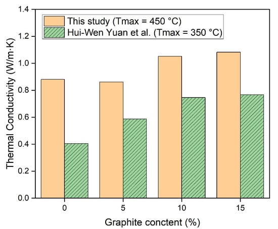 Therefore, the test results revealed that the thermal conductivity of the concrete containing graphite in this study was greater under high-temperature conditions than that of the control specimen. Additionally, the test results of the thermal conductivity after high-temperature thermal cycles in this study and previous studies are compared in Figure 11. As shown in the figure, the thermal conductivity results of this study after high-temperature exposure were higher than those of previous studies [25]. Furthermore, the thermal conductivity of graphite-incorporated concrete in this study was greater than that of the concrete using high-temperature material in previous studies, as shown in Table 5.