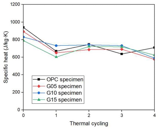 A higher graphite mixing ratio correlated with a lower specific heat. Specifically, at room temperature, the specific heats of the G05, G10, and G15 specimens decreased by 5%, 11.6%, and 16%, respectively, compared with the specific heats of the OPC specimens. The specific heat of the OPC specimen after high-temperature exposure (after four cycles) was 710 J/kg·K; the specific heats of the G05, G10, and G15 concrete specimens were 576, 590, and 625 J/kg·K, respectively; and the specific heat of the specimen mixed with graphite was lower than the specific heat of the reference specimen. After one heating cycle, the specific heats of the OPC, G05, G10, and G15 concrete specimens decreased by 28.7%, 27.1%, 11.8%, and 23.7%, respectively, compared with the specific heat at room temperature. Specifically, the specific heat reduction rates of the G05, G10, and G15 specimens were lower than that of the OPC specimen. Thus, the graphite-mixed concrete specimen had better thermal resistance performance under high-temperature conditions than the concrete of the standard specimens.