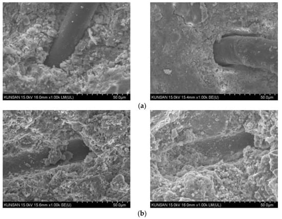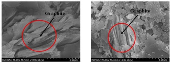 To analyze the internal structural characteristics of the concrete at room temperature and after exposure to high temperatures, scanning electron microscopy (SEM) imaging was performed, and the results are presented in Figure 13. The morphology of the concrete was investigated via scanning electron microscopy (SEM; SU8820, Hitachi, Tokyo, Japan). After high-temperature exposure, the P.P. fibers had dissolved in all test specimens, which resulted in the formation of voids at the dissolved locations. The formation of voids in concrete contributed to the prevention of the spalling of concrete at high temperatures, but could cause degradation in the strength and thermal conductivity of the concrete. The presence of graphite within the concrete could also be observed because of its incorporation in the concrete used in this study, as shown in Figure 14. The flaky and layered characteristics of graphite weaken the structural cohesion of the mixture, decreasing the mechanical properties compared to concrete with only OPC. Nevertheless, the dispersion of graphite, as well as concrete hydration products, improves the performance under high-temperature conditions, because the thermal resistance of graphite helps improve the stress transfer within the sample.