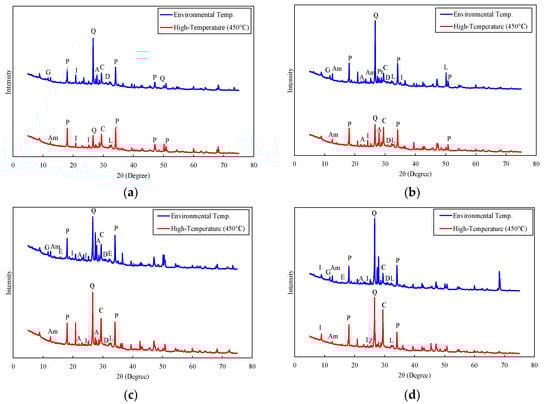 The crystalline structure of graphite concrete was examined via the X-ray diffraction (XRD) method, with a Malvern Panalytical Empyrean device (Malvern Panalytical Ltd, Malvern, UK) under Cu Kα radiation. The X-ray diffraction (XRD) analysis results of each concrete series at room temperature and after exposure to a high temperature of 450 °C are shown in Figure 15, and for reference, the components of the concrete analyzed from the XRD measurements and their chemical formulas are provided in Table 6.