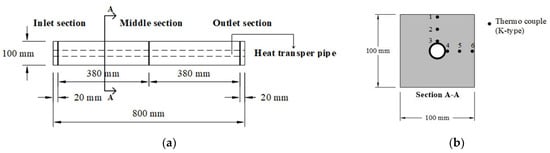 The concrete of each mixture was cast into a mold with dimensions of 100 mm × 100 mm × 800 mm. Heat exchanger pipes with an outer diameter of 17.4 mm, an inner diameter of 13.4 mm, and a length of 100 mm were embedded in the center of the concrete block to allow heat to transfer between the heat exchanger pipe and the concrete block. Temperature sensors were embedded to measure the temperature distribution. The temperature sensors were installed in three sections of the concrete block: inlet section, middle section, and outlet section; additionally, six temperature sensors were installed in each section. The concrete block and positions of the sensors are shown in Figure 16 and Figure 17, respectively. As shown in Figure 17b, for six temperature sensors, numbers 1, 2, and 3 correspond to the surface, the surface-to-center, and the center of the concrete block in the vertical direction, while numbers 4, 5, and 6 correspond to the center, the center-to-surface, and the surface of the concrete block in the horizontal direction, respectively.
