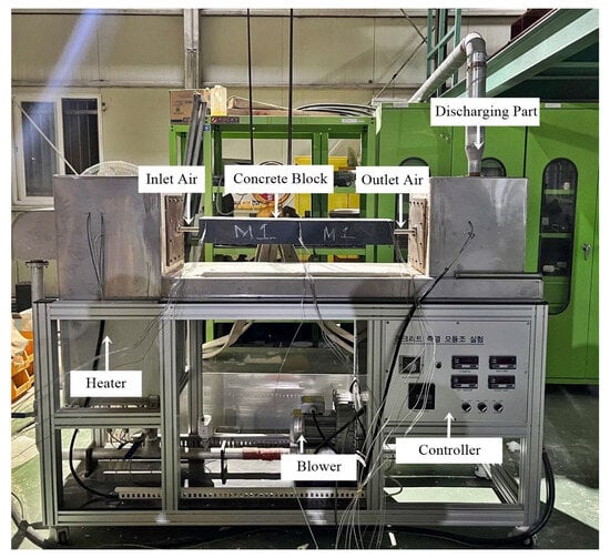 An experimental device for simulating heat transfer between the heat transfer fluid and the concrete block, which incorporates heating and cooling cycles, is shown in Figure 18. The experimental device for heat transfer simulation consisted of a heat transfer fluid supply (blower), heater, concrete block, and controller. The blower located at the bottom of the device blew air at a constant velocity. The air blown from the blower was heated to the target maximum temperature of 400 °C by a heater and then passed through the pipe embedded in the concrete block as a heat transfer fluid. When the heat transfer fluid passes through the pipe in the concrete block, the process involves heat transfer from the heat transfer fluid to the concrete block (i.e., charging process) and heat transfer from the concrete block to the heat transfer fluid (i.e., discharging process). The controller of the device controlled the flow rate of the heat transfer fluid. It could also measure the difference in pressure between the inlet and outlet fluid in the concrete block and the temperature of the heat transfer fluid at the inlet and outlet of the concrete block. To minimize heat loss from the concrete block, the surface of the concrete block was covered with insulation.