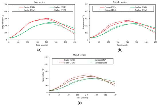 Comparison of the temperature distributions between the experimental and numerical results for the G10 concrete block: (a) inlet section, (b) middle section, and (c) outlet section.