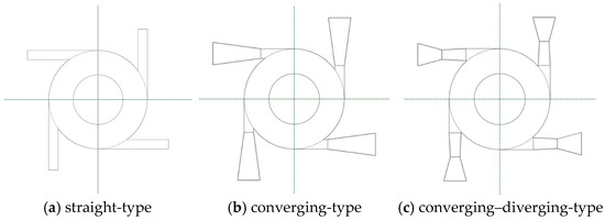 Figure 2 shows the structure of three inlet nozzles designed in this study. The cross-section of the flow channel at the inlet nozzle is square. Their specific geometrical parameters are listed in Table 1.