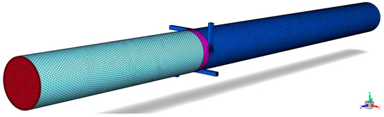 The three-dimensional geometric models of vortex tubes were constructed with SolidWorks 2023, and then meshed using a poly-hexcore scheme in fluent meshing, generating hexahedral cells in the core region of the flow domain while creating polyhedral cells with local refinement in the near-wall regions. The skewness was controlled under 0.6. As an example, a mesh model of the vortex tube with straight nozzles is shown in Figure 3.