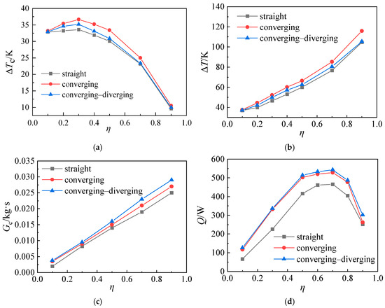 Figure 5b shows the impact of cold mass fraction on the temperature difference between the cold outlet and hot outlet of vortex tubes, namely the temperature separation effect. The maximum temperature separation effect of vortex tubes is observed at the cold mass fraction of 0.9. This is attributed to the continuous increase in the hot-end temperature rise with the elevation of the cold mass fraction. Among them, the vortex tube with converging-type nozzles has the best temperature separation effect, reaching 115.9 K, followed by the vortex tube with converging–diverging-type nozzles (105.3 K). And the vortex tube with straight-type nozzles has the worst temperature separation effect (104.7 K).
